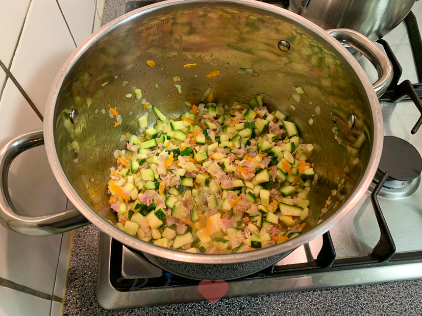 … Er ligt nog een grote courgette uit de moestuin die op moet. De laatste courgetteoogst van het jaar. (Heb ik je al verteld hoe geweldig het is om courgette te planten in je moestuin? We hebben er de hele zomer tot nu van kunnen oogsten!) Ik ga voor een romige risotto met courgette, wortel (ook uit eigen moestuin) en spekjes. Ik hou van dit soort eenpansgerechten. Bomvol smaak en zo makkelijk om te maken. Het perfecte comfort food! Een compleet vegetarisch hoofdgerecht, maar mocht je toch een stukje vis of vlees missen: gepaneerde witvisfilet of kipfilet, krokant goudbruin gebakken smaakt er heerlijk bij.