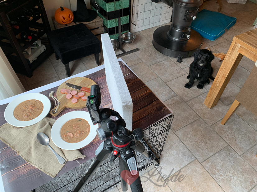 - Nacho kijkt nieuwsgierig toe hoe ik zijn Bench omtover tot fotostudio.