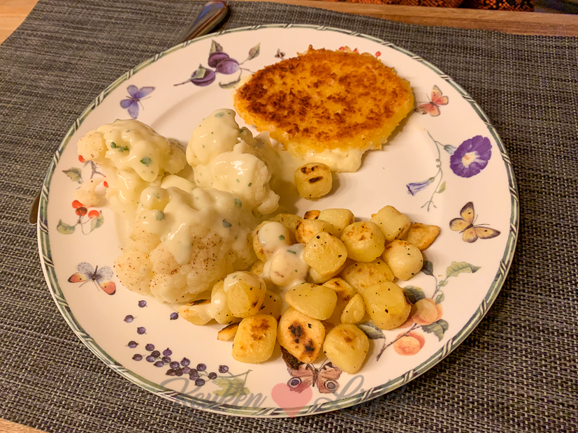 ’s Avonds kookt Johan. Eten genoeg in huis zou je zeggen, maar Johan en en Ella-Marie houden niet van bruine bonensoep (die breng ik van de week dus naar mijn ouders) en de quesadilla’s en Gooise dip zijn niet echt geschikt als avondeten. Er wordt ’s avonds dus weer gewoon gekookt. Johan had zin in een Hollands agv’tje: krieltjes, kaasschnitzel en bloemkool met, ahum, kaassaus (net zoals mayo kun je nooit genoeg kaas eten) it is! Helemaal prima voor een doodgewone dinsdag.