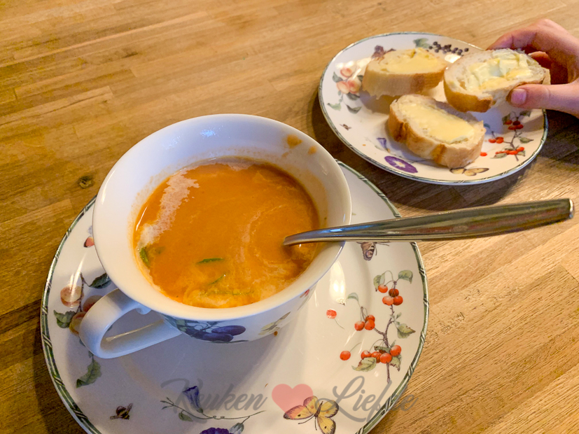 Aan het eind van de middag halen Johan, ik en Nacho Ella-Marie weer op bij de pond. Weer thuis maak ik zelfgemaakte tomatensoep voor Ella zodat ze die voor de voetbaltraining kan eten. Een stokbroodje met kruidenboter mag natuurlijk niet ontbreken.