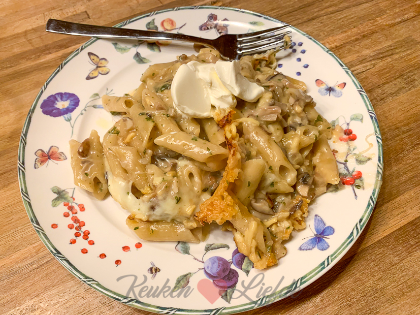 Johan en ik eten later een pasta-ovenschotel met champignonroomsaus. Makkelijk om te maken want je hoeft de pasta niet eerst voor te koken, hij gaart vanzelf in de saus in de oven! Recept komt morgen online! 🙂