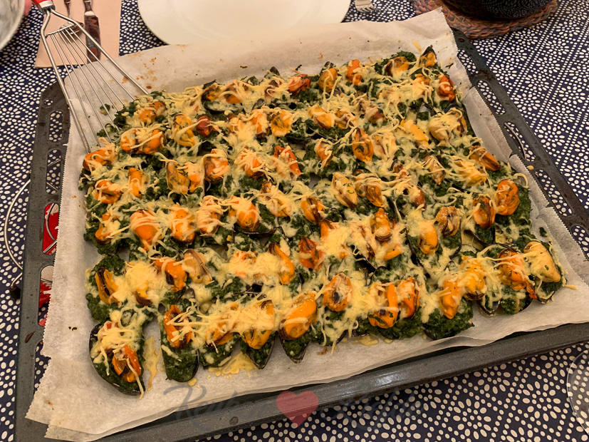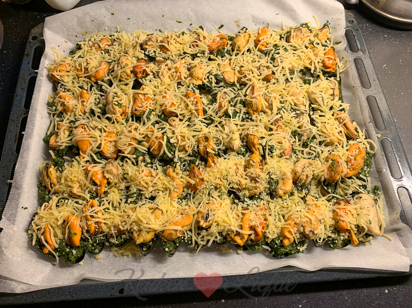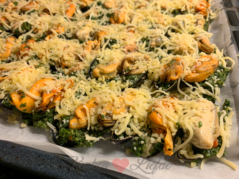 - Gegratineerde mosselen van het bakblik met spinazie en kaas