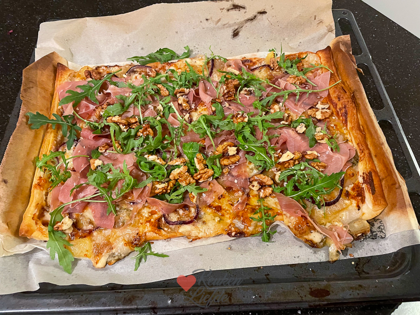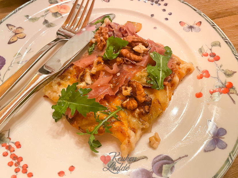 Als Johan en Ella de deur uit zijn en ik het recept voor vandaag heb gepubliceerd, ga ik de keuken in om een ontbijtje te maken. Vriendinnetje Miranda komt zo gezellig ontbijten. Ze had zelf nog lekkere gebakjes meegenomen die we ook op tafel zetten. Was supergezellig. Daarna werkte ik nog even op kantoor en niet veel later kwam Ella weer thuis uit school. Voor het avondeten maakte ik een plaattaart van bladerdeeg die ik besmeerde met magor en belegde met gebakken witlof, peer, rode ui en gorgonzola. Na het bakken in de oven ging er nog rucola, Parmaham en waltnoot overheen. Het recept lijkt hierop. Erg lekker!