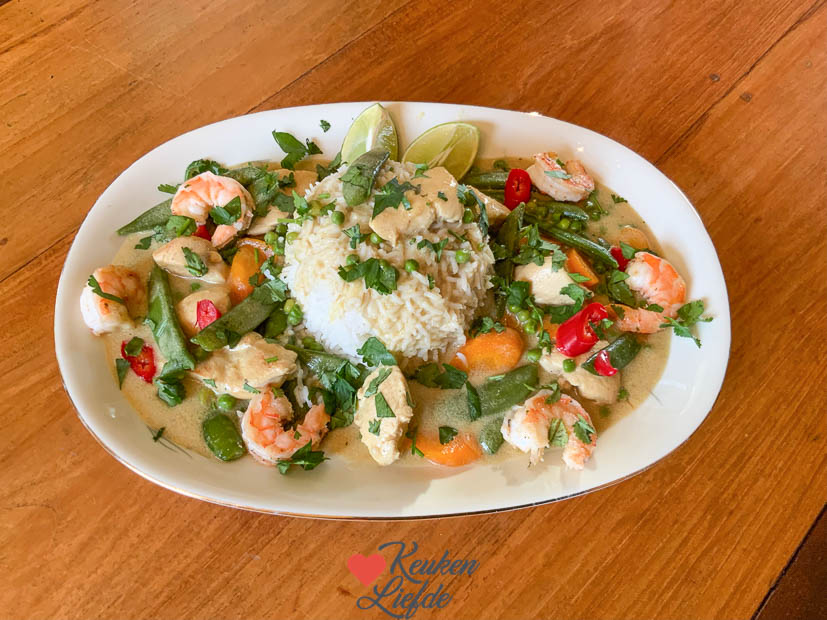 Ik zat vandaag grotendeels achter de computer en maakte helemaal geen foto’s. Was ook niet veel te zien. 😉 Wel kreeg ik ’s middags een foto met eten doorgestuurd van mijn moeder. Ze had de Thaise groene curry uit ons kookboek Makkelijke Wereldgerechten gemaakt en die vonden ze heerlijk! Het recept in ons boek is trouwens met kip maar mijn moeder voegde nog extra garnalen toe. Je kunt de curry ook alleen met vis maken of vegetarisch maken als je de kippenbouillon door groentebouillon vervangt en de kip weglaat of vervangt door tofu. Dit recept is ook echt een favoriet van ons die regelmatig op tafel komt in allerlei variaties. Zo verkruimel ik ook vaak glasnoedels in de curry die ik even laat meegaren en serveer het dan meer als currysoep met een gekookt eitje erin. De groenten vervang ik dan door soepgroenten.