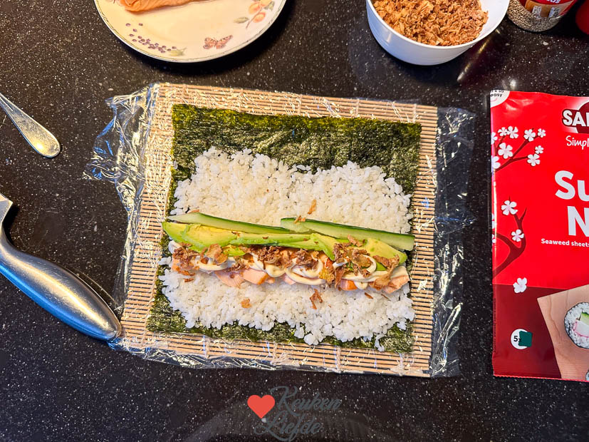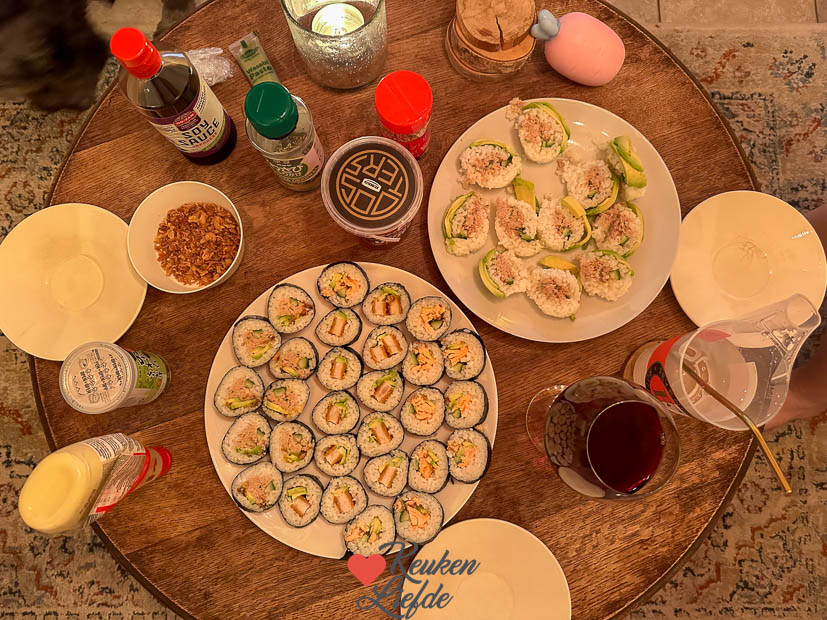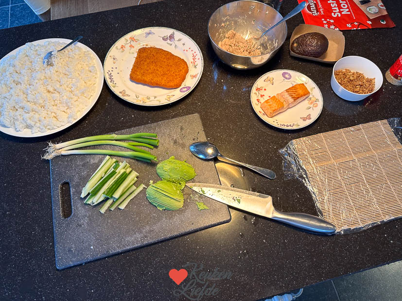 Ella-Marie kan ’s ochtends een beetje uitslapen maar niet te lang want begin van de middag heeft ze een voetbalwedstrijd. Gelukkig is het een thuiswedstrijd. Een paar uur later komt ze opgetogen weer thuis want ze hebben gewonnen! Als ze vervolgens ziet wat ik aan het maken ben kan haar dag niet meer stuk. Ik maak haar favoriete eten: sushi! Ik maakte drie verschillende rollen: met zalm (in de oven gegaard want rauwe sashimi vis is hier niet te krijgen), reepjes kipschnitzel en tonijnsalade. Het recept van onze favoriete sushirollen vind je in ons kookboek Familiegerechten! ’s Avonds houden we een filmavondje en komt de sushi op tafel. Ik had voor de laatste rol geen nori meer en probeerde een inside out rol te maken maar dat was geen succes. 😂 Gelukkig was er niks mis met de smaak.