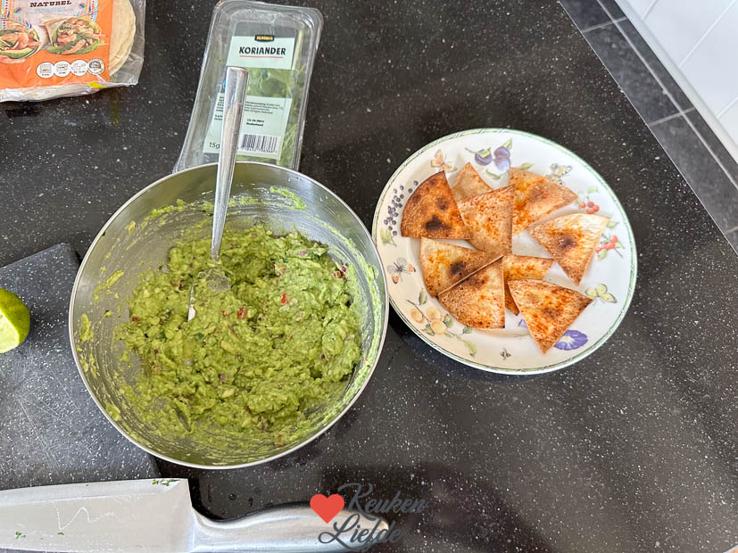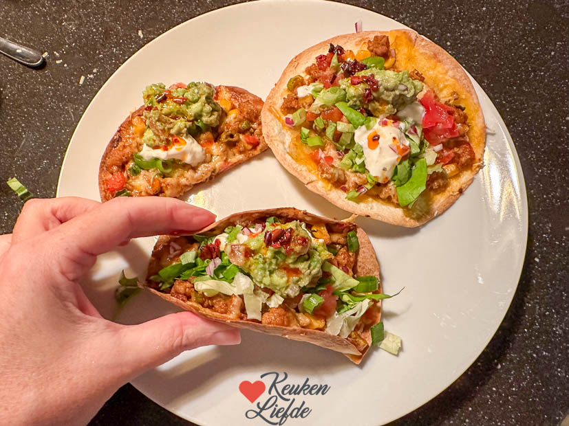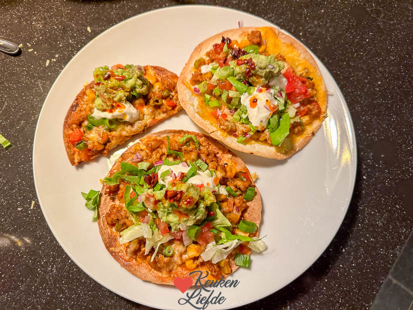 Ella-Marie zit tot en met vrijdag met haar klas in London, Johan is werken en ik vermaak me alleen thuis. Zoals elke ochtend begin ik mijn dag met een kop cappuccino waarmee ik achter de computer kruip. Ik schrijf het Kijkje in de keuken en als die gepubliceerd is, ga ik de keuken in om wat lekkere recepten te maken. Ik maakte romige guacamole met zelfgemaakte tortillachips en tostada’s met kipgehakt. Recept van de tostada ga ik snel met je delen! Tijdens het koken krijg ik foto’s doorgestuurd van de tiener uit London die op dat moment in Chinatown liep. De tostada’s warmde ik ’s avonds opnieuw op als avondeten voor mij en Johan. Als de tostada’s net uit de oven komen beleggen we ze met wat sla, pico de gallo, guacamole, zure room en een drizzle crispy chili olie. Smaakbommetje!