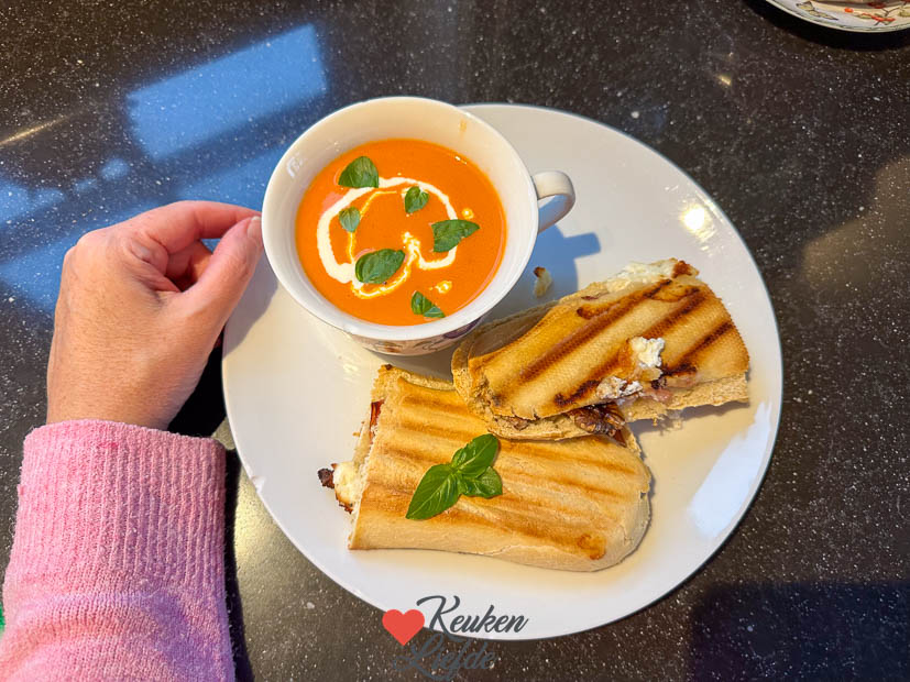 Ella-Marie heeft een weekje herfstvakantie en is gezellig thuis. Ik begin de ochtend op kantoor. ’s Middags rijden Ella en ik even langs mijn ouders en daarna halen we een boodschapje voor het avondeten. Op verzoek van Ella maakte ik deze tomatensoep met geitenkaas-hampanini’s.