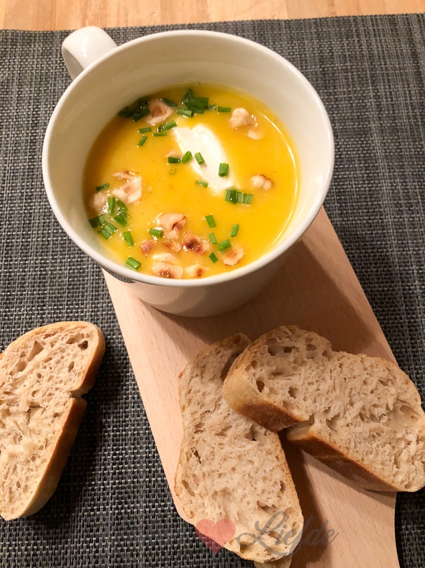 In de kelder heb ik nog een halve flespompoen liggen dus ik besluit pompoensoep te maken voor het avondeten. Ik ben niet echt een soepkont, maar het is koud buiten en ik ben niet helemaal fit en soep is het enige waar ik zin in heb. Ik maak een eenvoudige pompoensoep en garneer hem met geroosterde hazelnoten, bieslook en een lepeltje crème fraîche. Stokbrood erbij en smullen maar! Het recept ga ik met je delen.