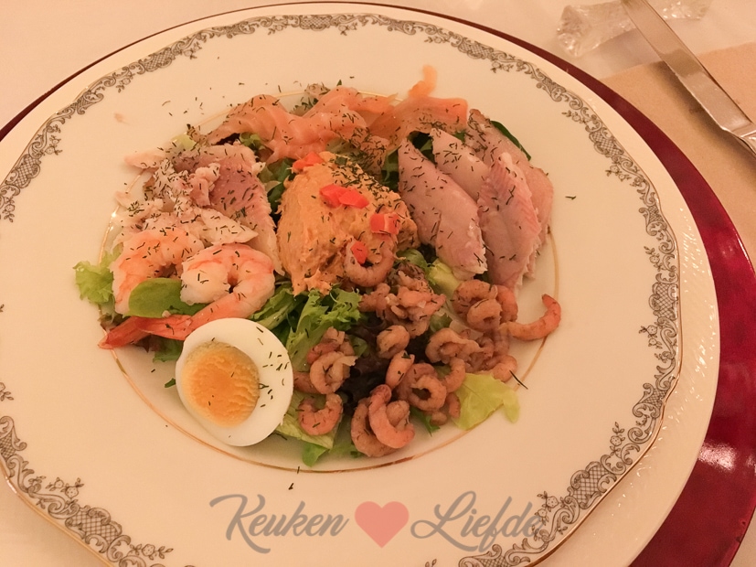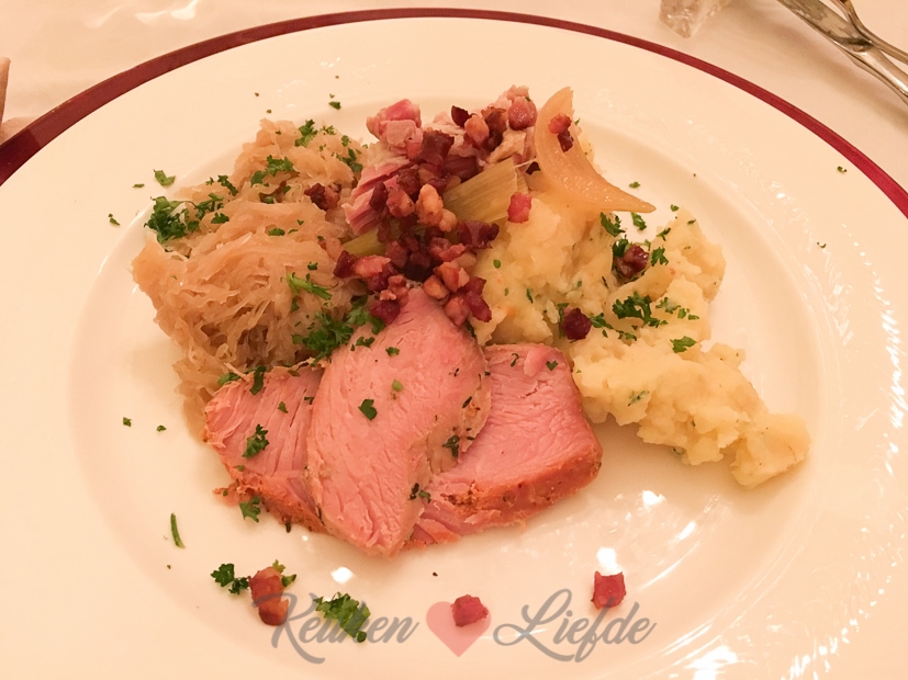 ’s Avonds schuiven we bij mijn ouders aan voor het verjaardagsdiner van moeders. Als voorgerecht krijgen we een visbordje en als hoofdgerecht krijgen we zuurkool (dit recept), aardappel-knolselderijpuree (dit recept), rookworsten, beenham uit de oven, gekookt zuurkoolspek, uitgebakken spekjes, ananas en mosterd. Kortom, een feestmaal!