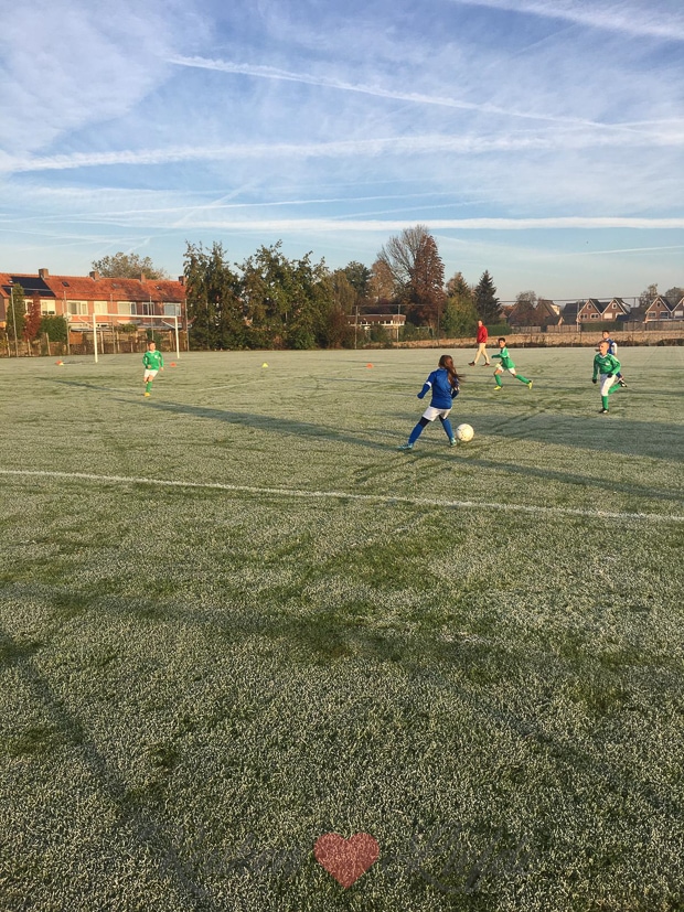 Ella-Marie heeft ’s ochtends een voetbalwedstrijd in Puiflijk en Johan stuurt deze foto naar me door. Bikkels!