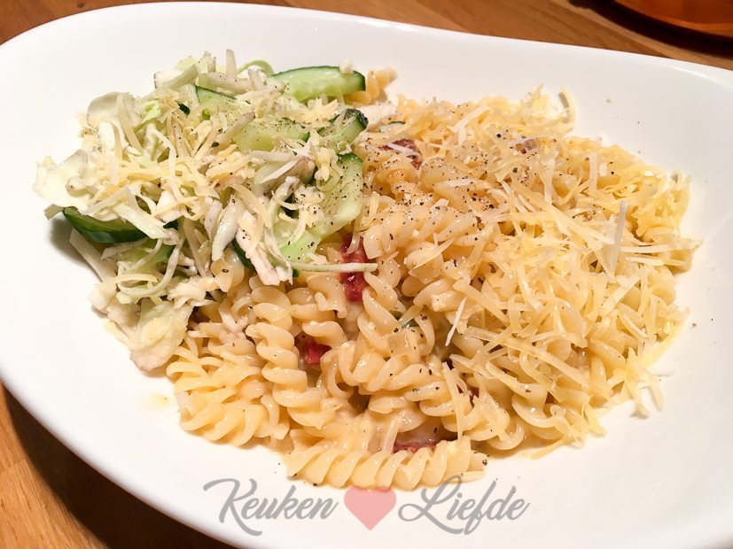 Johan en ik eten later als El op bed ligt pasta carbonara.