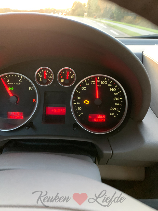 Johan is vrij vandaag en samen halen we de nieuwe auto op. Onderweg naar huis gaat er echter een lampje branden die niet hoort te branden. Kak! Hebben wij weer…
