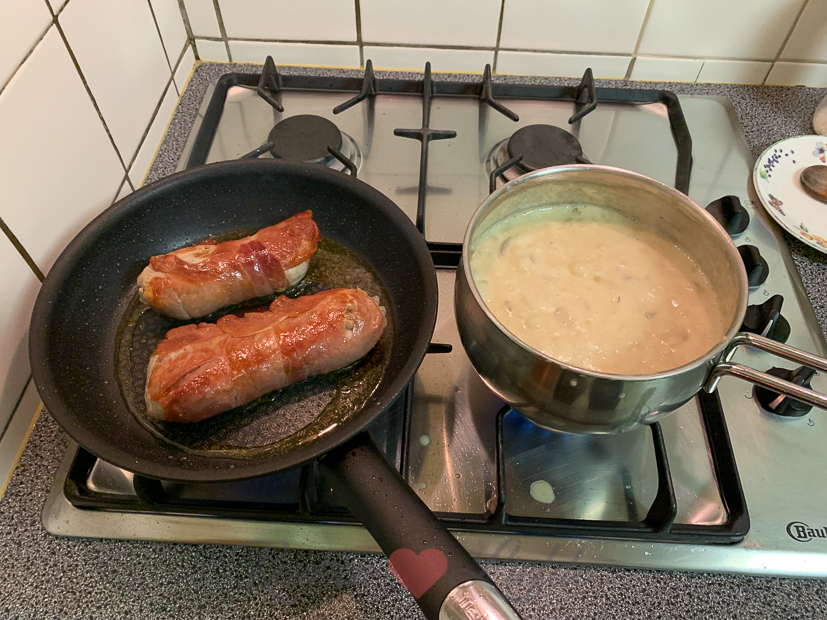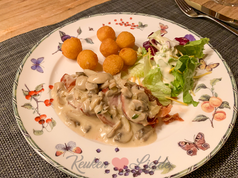 Vanavond eten we gebakken varkenshaas in Parmaham met zelfgemaakte champignonroomsaus, aardappelbolletjes uit de frituur en salade. Feestmaal! En o zo makkelijk om te maken.