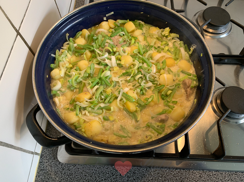 Het fijne van grote eenpansgerechten is dat wij er met ons drieën makkelijk twee dagen van kunnen eten. Vandaag hoef ik dus alleen maar op te warmen. Op mijn portie gaat nog een extra klodder zure room en wat Parmezaan. Tja, wat zal ik zeggen. Zo ben ik. Ze noemen me ook wel mevrouw Klodder.