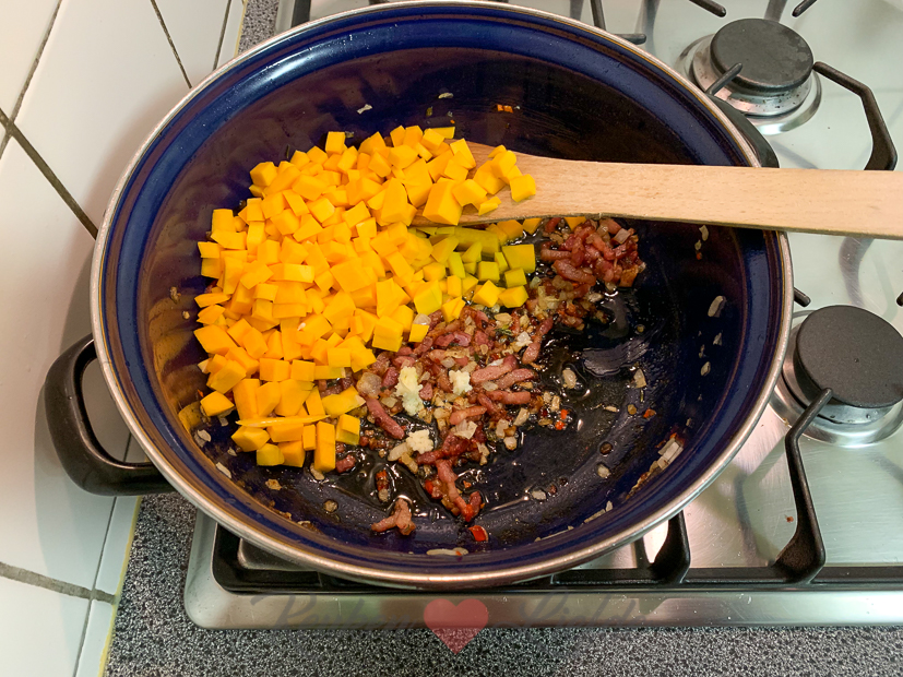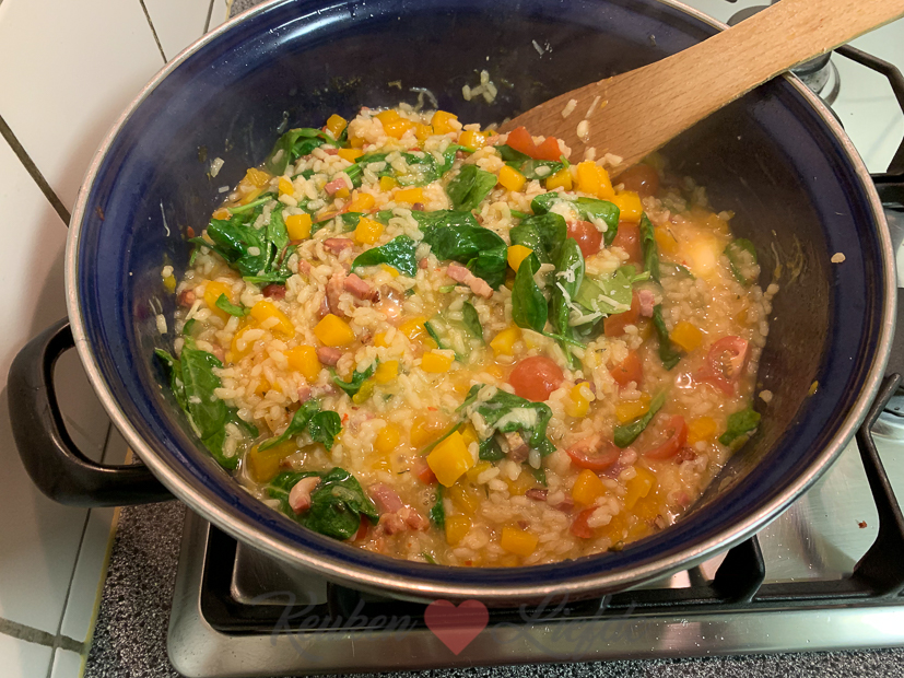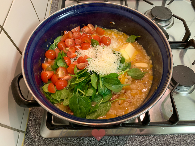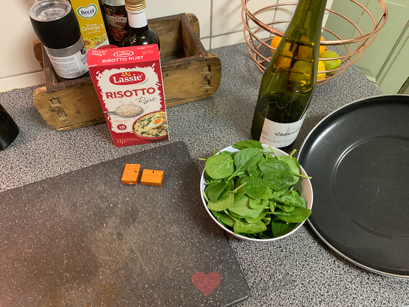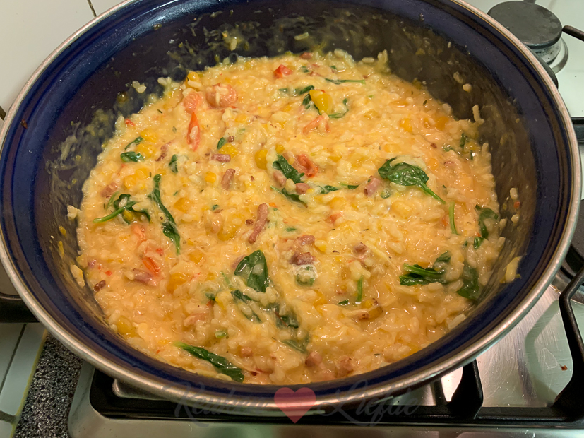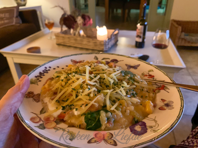 Tijd om aan de slag te gaan met het avondeten. In de kelder ligt nog een prachtige flespompoen die we kregen van Johan zijn tante en ik heb ook nog spinazie en cherrytomaten in huis. Ik besluit een romige (wat is een leven zonder room?) pompoenrisotto te maken met spekjes, spinazie en tomaatjes. Ella-Marie eet al eerder omdat ze op tijd naar voetbaltraining moet. Johan en ik eten de risotto ’s avonds op de bank voor de tv. Guilty pleasure!