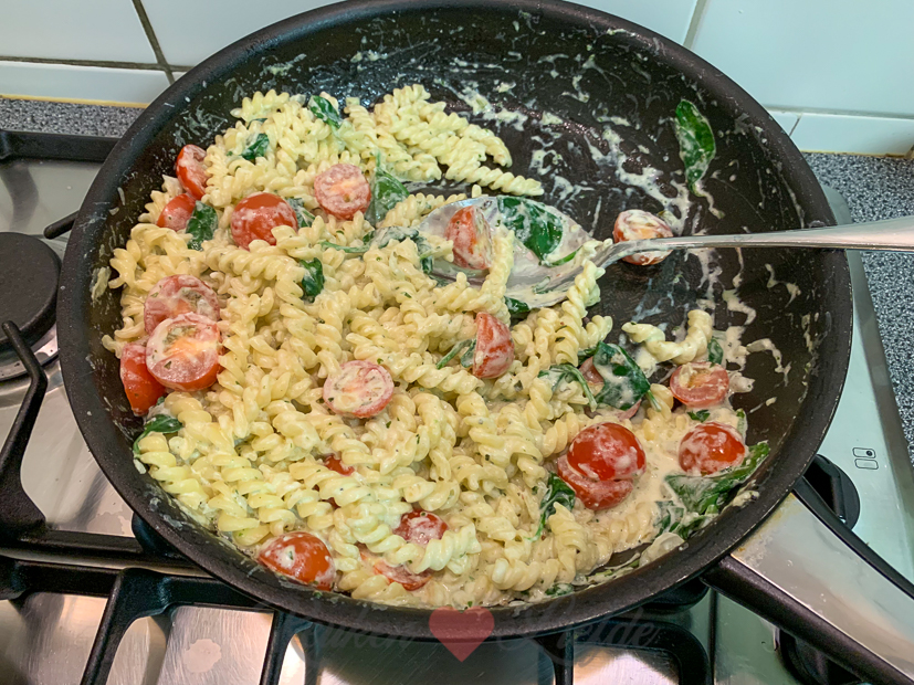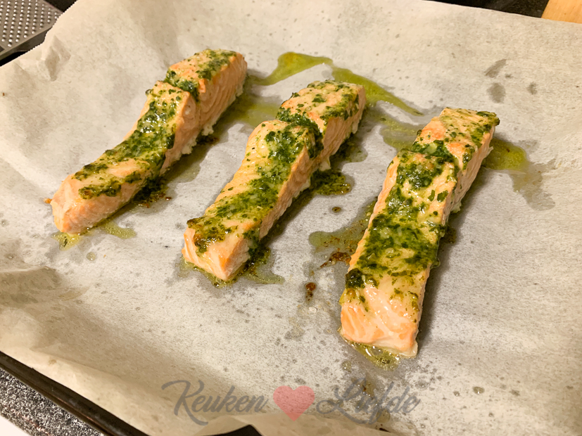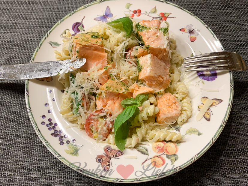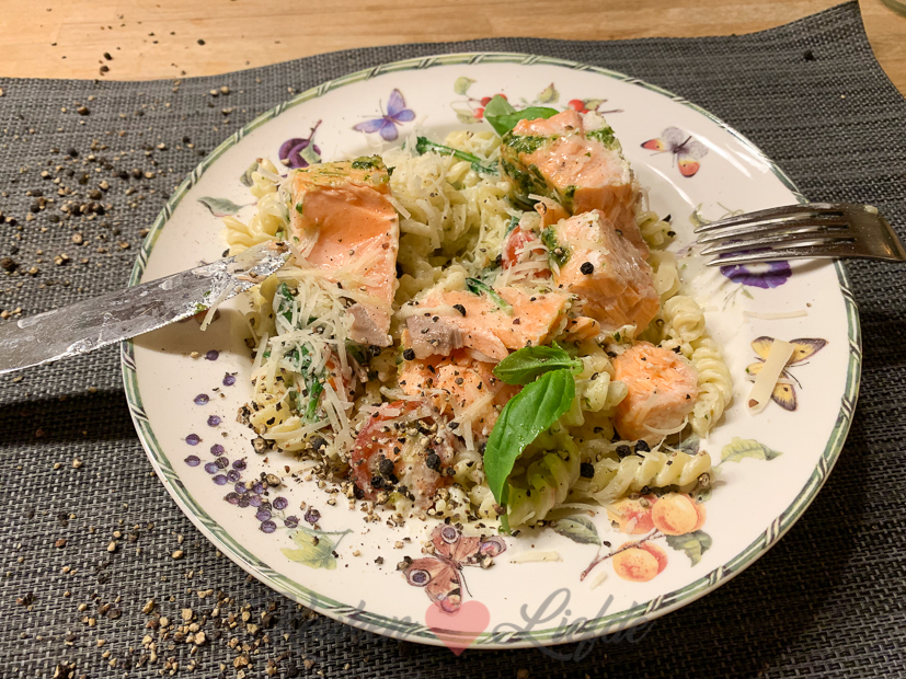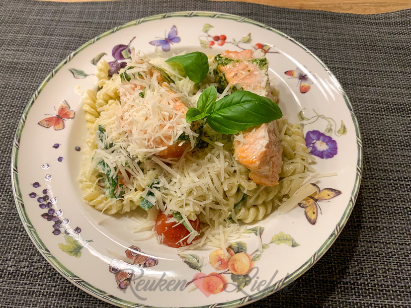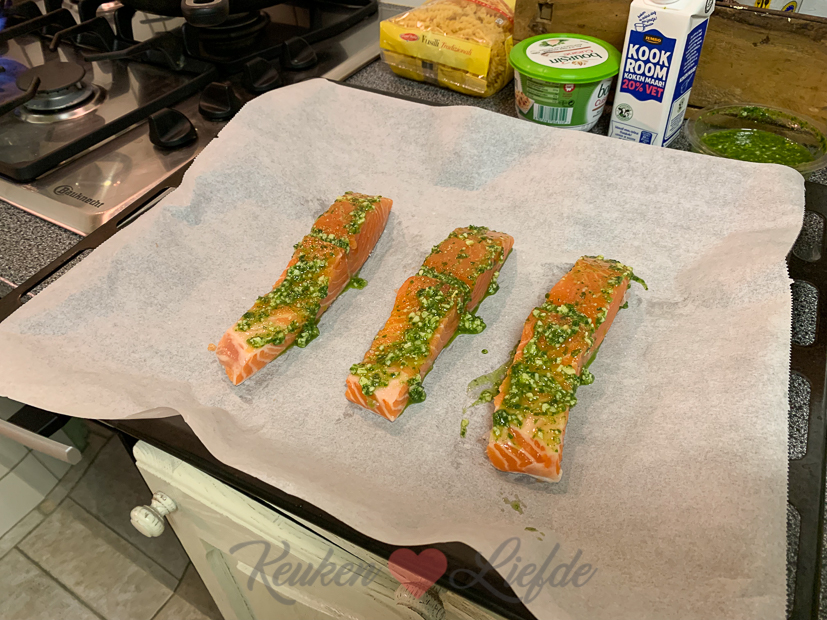 Kun je je dat grote stuk zalm nog herinneren dat we van Johan zijn ouders kregen? Ik heb het uiteindelijk toch in porties gesneden en in meerdere diepvrieszakken ingevroren. Drie porties zalm had ik bewaard in de koelkast voor vanavond. Ik maak een lekkere pasta met Boursin, spinazie en tomaten en daarbij de zalm die ik bestrijk met pesto en bak in de oven.