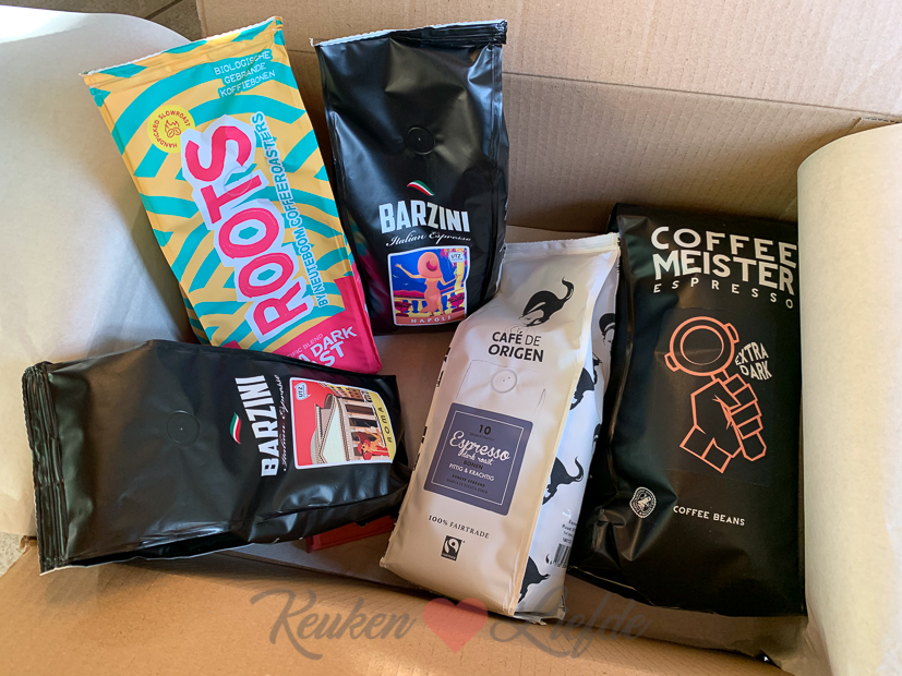 Dit pakketje wordt ’s middags thuisbezorgd: verschillende soorten koffiebonen van Coffeemeister. Johan en ik zijn al een tijdje aan het uitproberen welke koffiebonen we het lekkerst vinden. We houden allebei van koffie met een krachtige, volle smaak. De vrolijk gekleurde zak Roots Extra Dark Roast proberen we meteen uit want de koffie in de automaat is op. De Roots koffie valt bijzonder in de smaak; hij is heel krachtig en tegelijk ook zacht. Echt een aanrader! 🙂