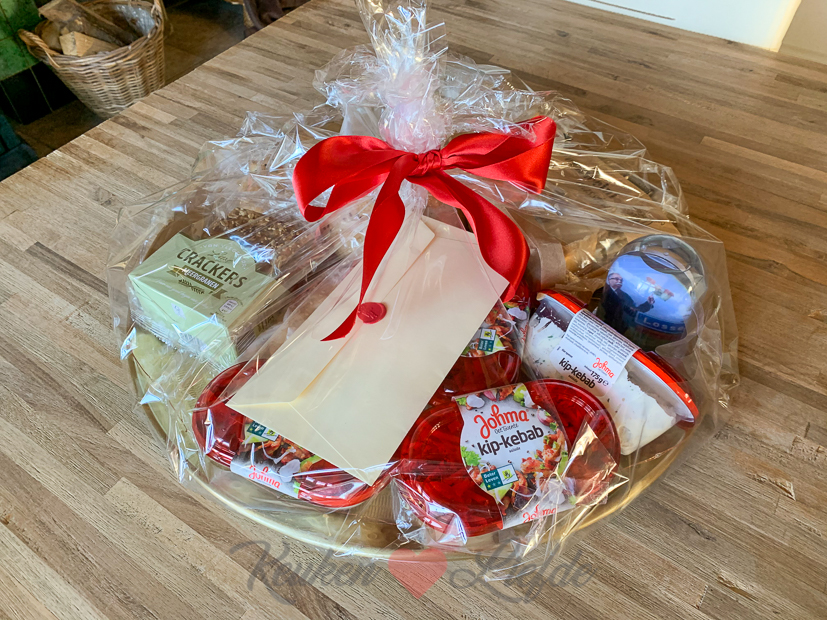 Tussendoor staan er twee leuke dames van Johma op de stoep. Ze brengen dit prachtige pakket met de nieuwe kip-kebabsalade en wat crackers en Turkse broodjes. Hoe leuk! Ik moet eerlijk bekennen dat ik nooit zo dol ben op kant-en-klare borrelsalades: teveel saus en weinig vulling. Dat vind ik bij deze salade ook, maar de smaak is wel goed! Zeker een lekkere salade voor op de borrelplank.