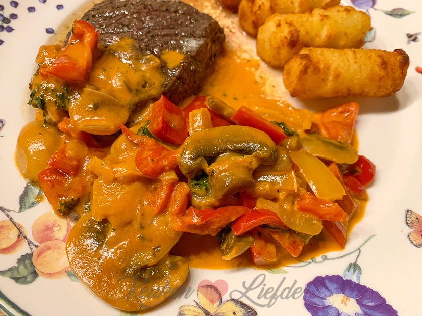 ’s Avonds eten we biefstuk met stroganoffsaus, frietjes, aardappelkroketjes en salade. Wat een verwennerij op een doordeweekse dag!