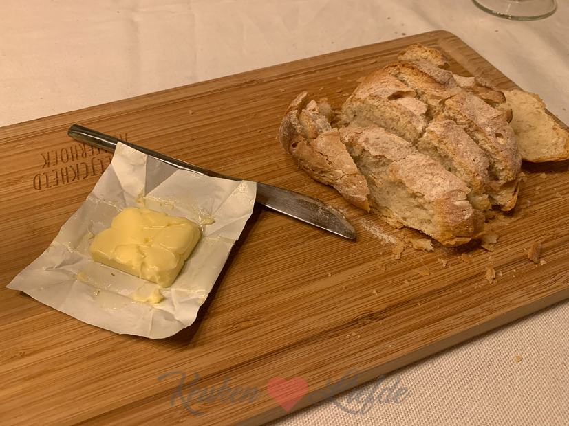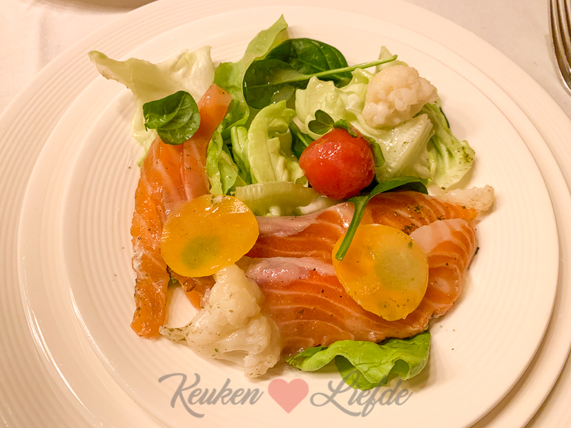 Als we weer thuis zijn staat me in de eetkamer een verrassing te wachten. De tafel is gedekt, terwijl er geen boodschappen zijn gedaan en er geen enkele pan op het aanrecht staat. Dan vertelt Johan dat hij een verrassing heeft geregeld om onze verjaardag alvast te vieren (Johan wordt volgende week 37 en ik word 40! ???) saampjes. Toen ik Ella-Marie ’s middags naar mijn ouders bracht, heeft Johan bij Restaurant Flicka (één Michelin ster!) in Kerkdriel een 4-gangenmenu afgehaald om thuis van te genieten. De stiekemerd! Alle gerechten zijn al voorbereid, je hoeft alleen zelf enkele dingen op te warmen. We trekken ons meest onflatteuze huispak aan, zetten foute kerstmuziek op, steken de houtkachel aan en trekken een flesje bubbels open. Proost! Op ons oudjes!