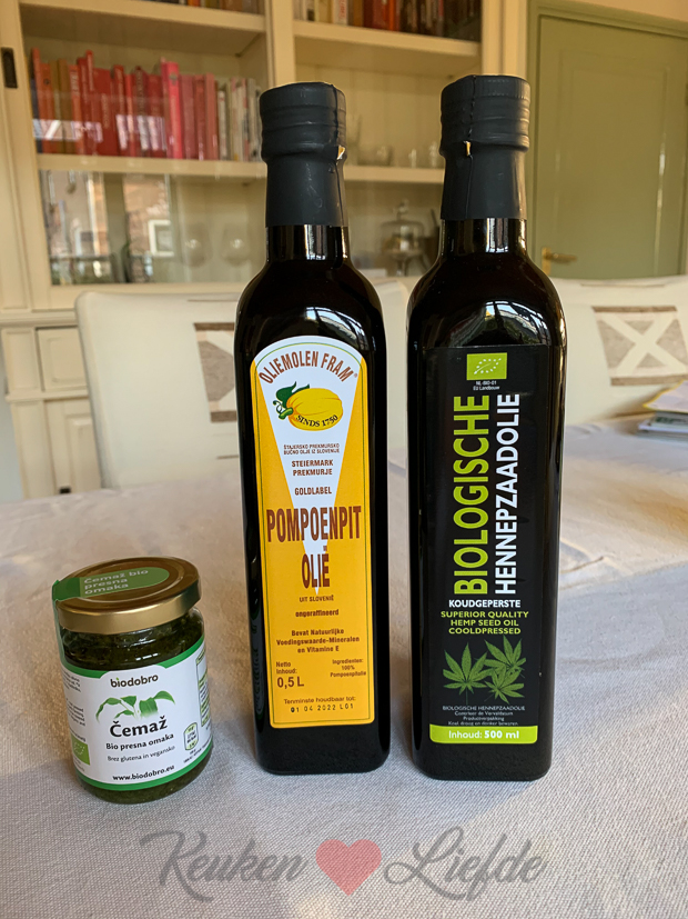 Na het ontbijt gaat Johan rommelen in de tuin en duik ik nog een paar uurtjes achter de computer om te werken. ’s Middags wordt dit pakketje thuisbezorgd van E-oil met daarin een fles biologische pompoenpitolie en hennepzaadolie en een potje CemaZ (een soort pesto gemaakt van daslook en olie) om uit te proberen. Vooral die laatste ben ik heel benieuwd naar. Ik heb verschillende soorten olie standaard in huis voor zowel koude als warme bereidingen en deze zijn dan ook heel welkom!