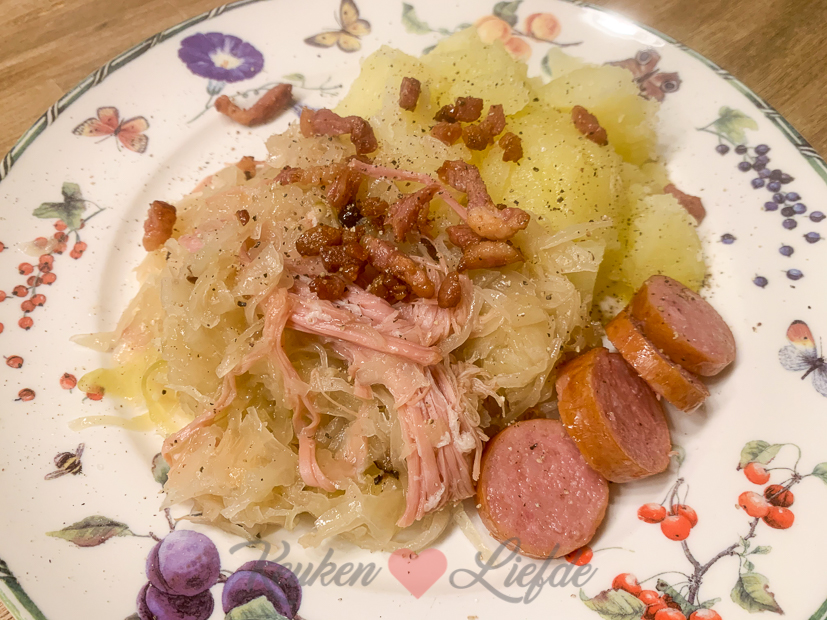 Vandaag staat er Elzasser zuurkool op het menu want daar hadden Johan en ik al heel lang zin in. Dit recept! Ik gebruikte dit keer reuzel (varkensvet) in het recept in plaats van boter en het resultaat was heerlijk! Ga ik voortaan altijd doen.
