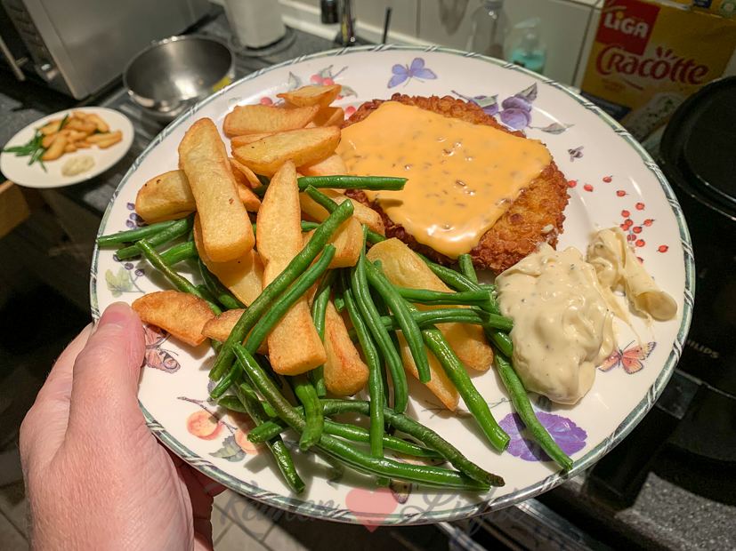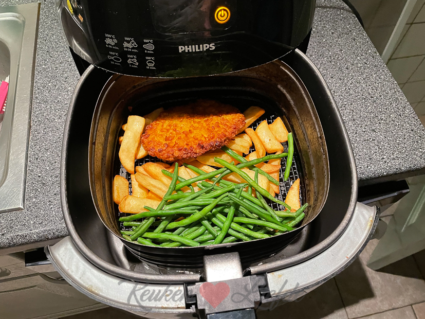 Ook vandaag is de schilder er weer. Johan en Ella-Marie zijn de deur uit en ik werk thuis op kantoor. Het avondeten komt uit de airfryer, die helaas wel wat kuren vertoont de laatste tijd (benieuwd hoelang hij het nog vol gaat houden). Op Instagram vroeg ik om ideeën voor het avondeten uit de airfryer en kreeg heel veel leuke reacties. Volg je ons hier al? In onze IG-stories delen we dagelijks stories van achter de schermen, of delen we lekkere recepten. Tip! Na 24 uur verdwijnen de stories maar kun je ze vaak nog terugkijken in de gearchiveerde highlights. Terug naar de airfryer; ik gooide er frietjes, kipschnitzel en sperzieboontjes in. Ging prima, alleen konden we niet allemaal tegelijk eten.