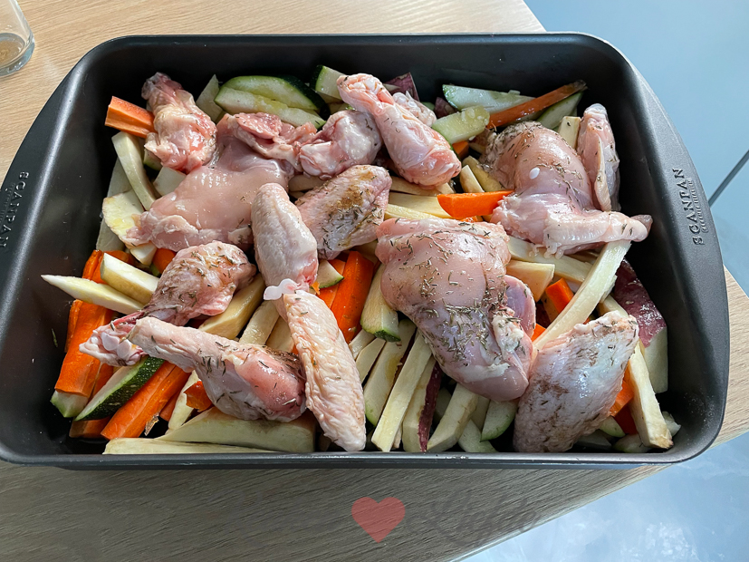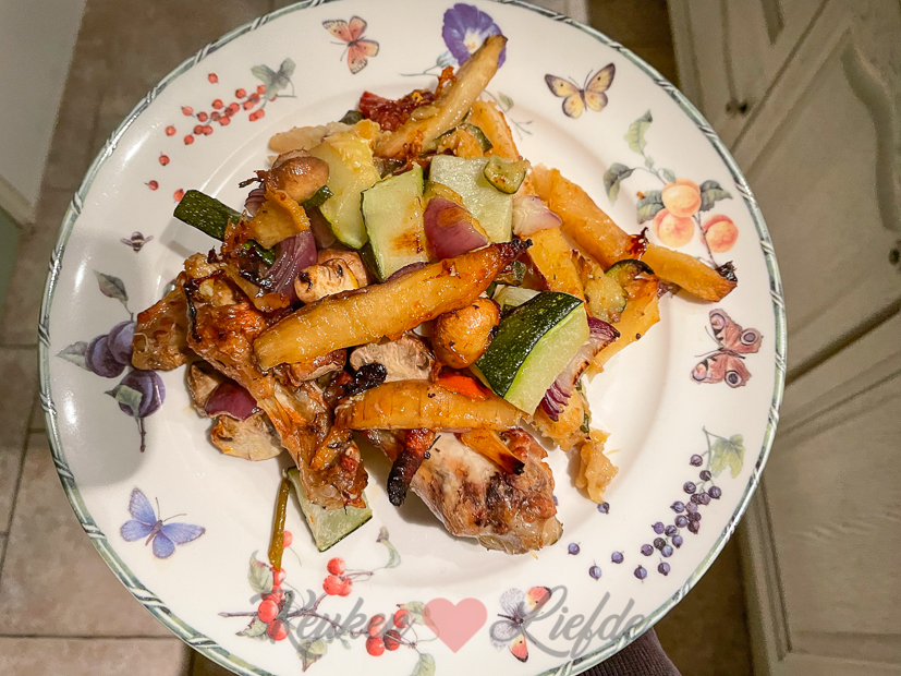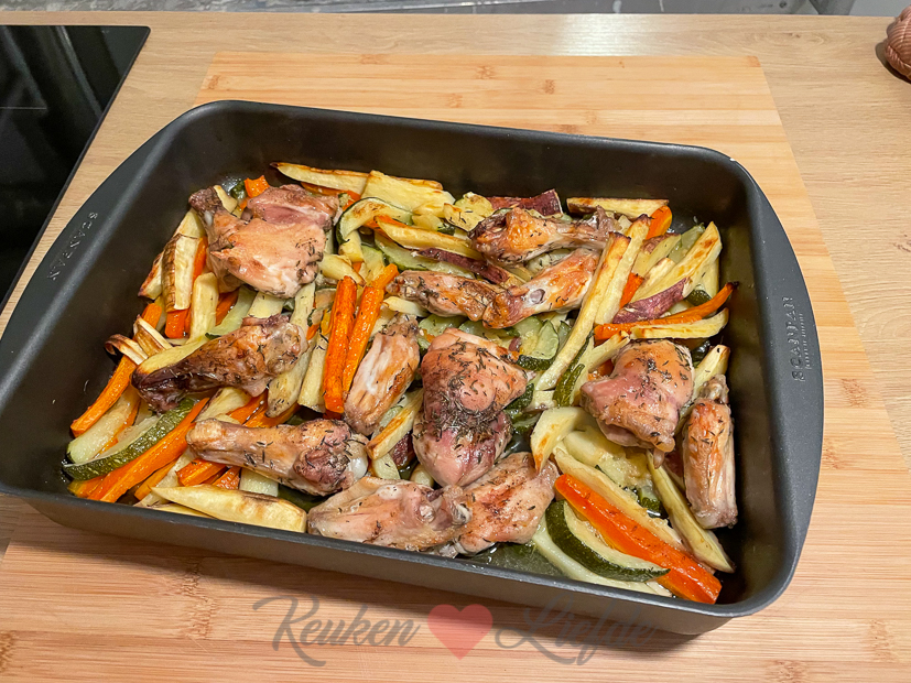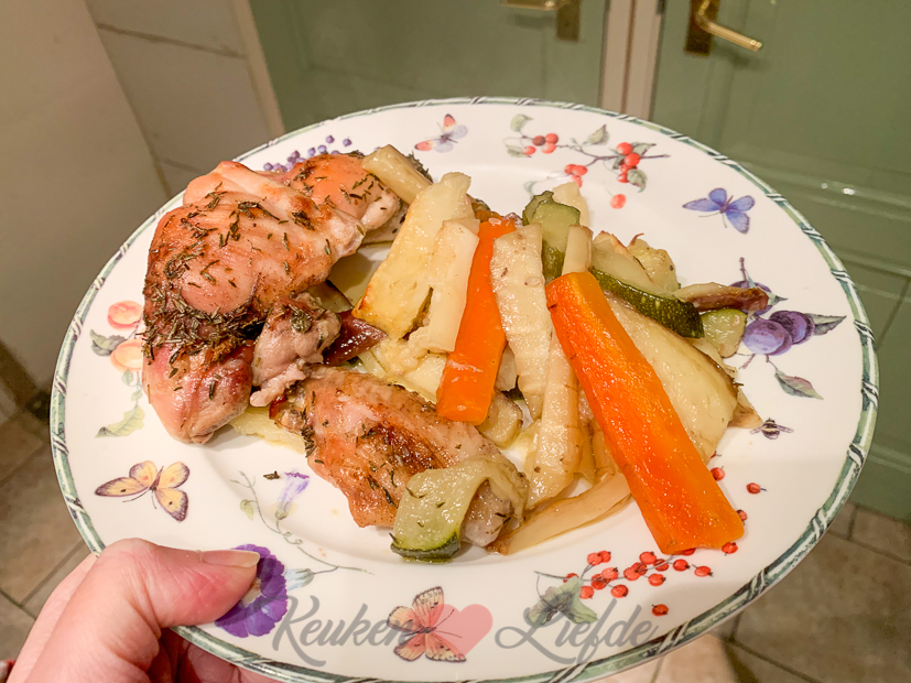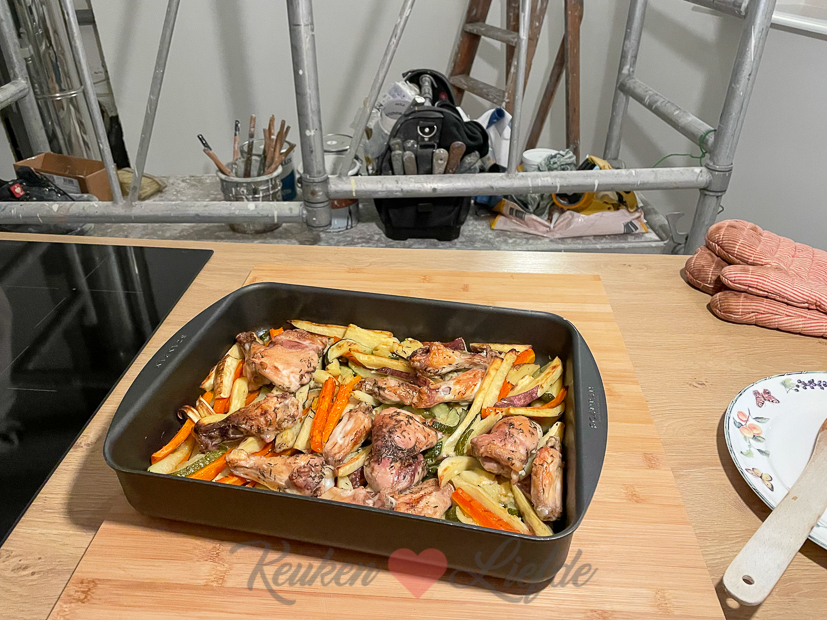 Vandaag wordt er niet geklust en heb ik een normale werkdag thuis op kantoor. Tussen de bedrijven door maak ik het huis een beetje schoon, al is dat lastig omdat door de verbouwing het overal in huis een rommeltje is en ik niet overal goed bij kan. Kriegelig wordt je ervan! ’s Avonds steekt Johan de stekker van de oven weer in het stopcontact zodat we een fatsoenlijke maaltijd kunnen eten. Groenten (zoete aardappel, pastinaak en wortel) met kip uit de braadslee. Dit recept maar dan uit de braadslee