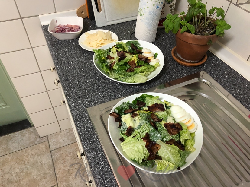 Ella-Marie gaat ’s middags naar opa en oma in Tiel om de sinterklaasoptocht te kijken en blijft meteen een nachtje logeren. Johan en ik zouden ’s avonds een club sandwich eten, maar op het laatste moment hadden we toch meer zin in een salade. Van het brood maakten we croutons en zie daar, een club sandwich salade is geboren! Was lekker joh! 🙂