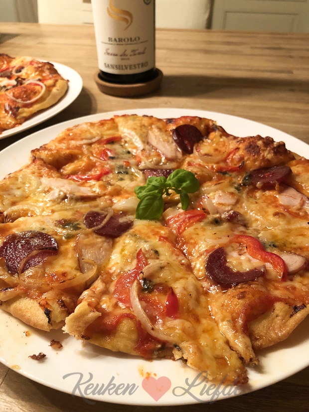 Voor mijn verjaardagsmaal maak ik pizzadeeg zodat we vanavond homemade pizza kunnen eten. Ella-Marie maak ik daar nog steeds niet blij mee, dus die krijgt een kommetje zelfgemaakte, verse tomatensoep met vers afgebakken stokbrood en kruidenboter. Iedereen blij. Bij de pizza trekken Johan en ik een lekkere fles Barolo open. 🙂