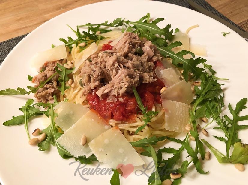 Ik had al tijden zin in dit gerecht: spaghetti met tomaten-tonijnsaus. Supersimpel om te maken en zo smakelijk! Echt een van mijn favoriete pastagerechten.