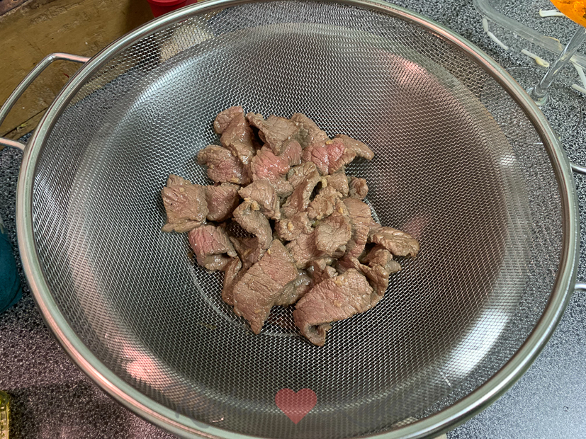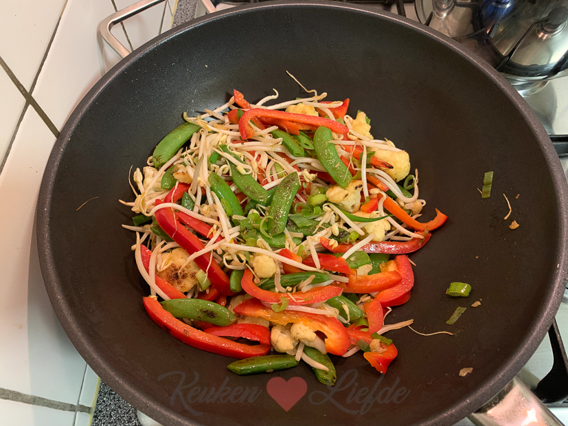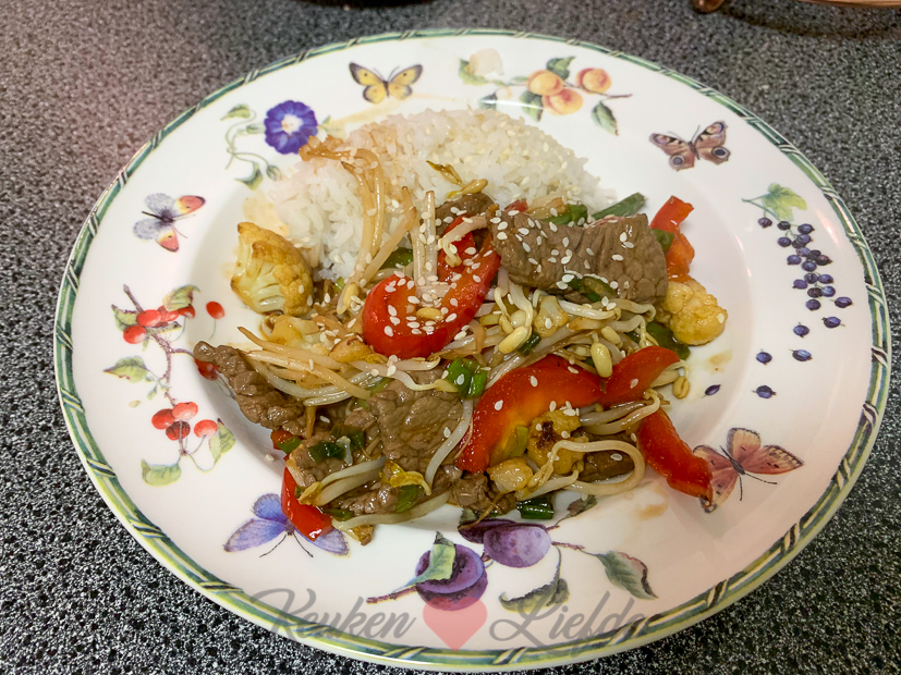 Na al die verwennerij van het afgelopen weekend heb ik ’s avonds zin in een maaltijd met veel verse groente. Ik maak een wokschotel met biefstukreepjes, bloemkoolroosjes, paprika, sugarsnaps en taugé. De biefstukreepjes laat ik van tevoren even marineren in een teentje uitgeperste knoflook, een tl versgeraspte gember, een scheut sojasaus en een druppel sesamolie. De woksaus maak ik van 4 el sojasaus, 2 el oestersaus, 1 el rijstazijn en een drupje sesamolie. Ik begin met het wokken van de biefstuk, heel kort. Dan laten uitlekken in een vergiet. Vocht opvangen! Wok schoonvegen en de groenten kort wokken (de bloemkool en sugarsnaps moeten het langst dus die gaan het eerste in de pan, dan de paprika en dan tauge). Ook eruit en bij de biefstuk in het vergiet. Dan de woksaus en het opgevangen kookvocht van het vlees en de groente in de wok en even laten inkoken. Biefstuk en groenten erdoor (en eventueel een flinke hand fijngehakte koriander of peterselie) en kort even opwarmen. Ik kookte er pandanrijst bij. Lekker, makkelijk en gezond!
