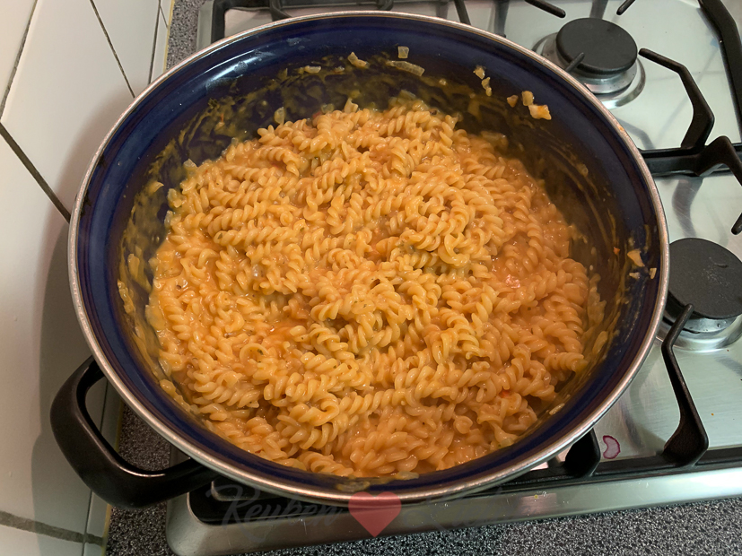 Als we weer thuis zijn ga ik ook de keuken in om te koken. Ik wilde tomatenrisotto maken maar tijdens het koken kwam ik erachter dat de risotto op was… Typisch ik. Ik plaats van risotto gebruik ik pasta want dat heb ik wel in huis. Ik bereidde de pasta net als ik de risotto zou maken. Dus ongekookt in de pan, bouillon erbij en net zolang koken tot de pasta gaar is. Geen culinair hoogstandje (ik had er net als moeders groenten doorheen moeten doen, maar die had ik ook niet meer in huis), maar prima te eten met een beetje kaas erover. Alles smaak beter met kaas.