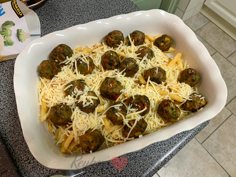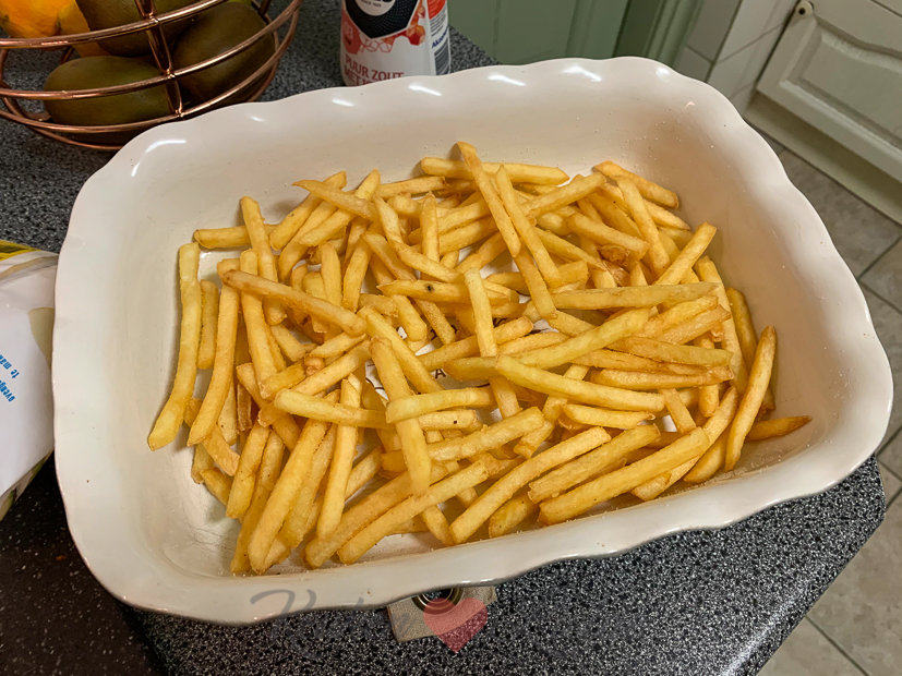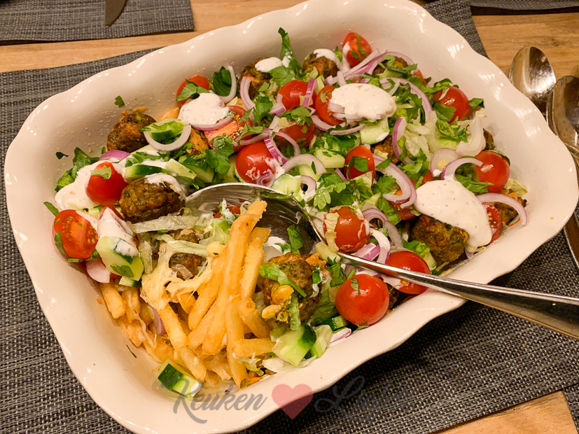Op het menu vandaag: frietje kapsalon met vega groenteballetjes (van IKEA)! Frietjes even bakken in de frituur en in een ovenschaal doen. Ondertussen groenteballetjes bakken in de oven en wat rauwkost snijden. Groenteballetjes over de friet en wat kaas erover. Even gratineren in de oven en dan de rauwkost en wat knoflooksaus erover.