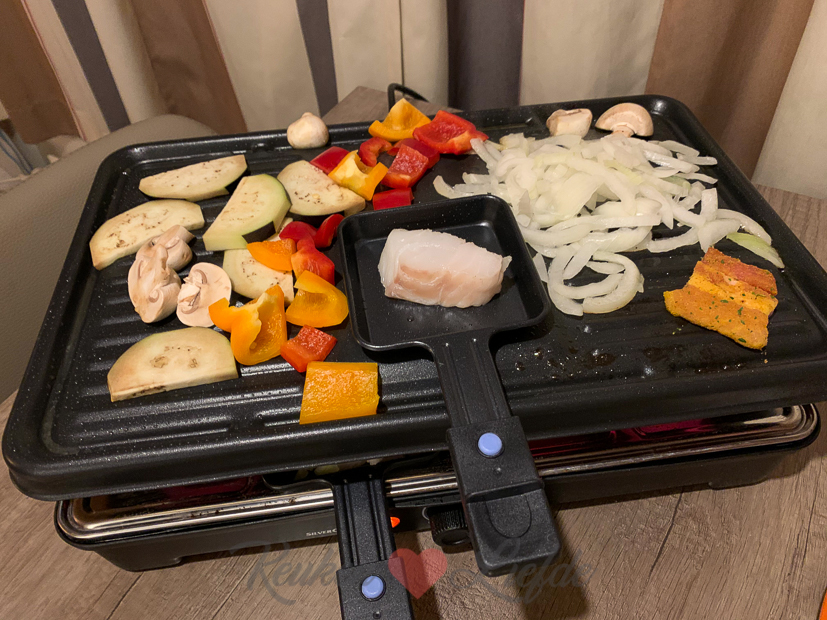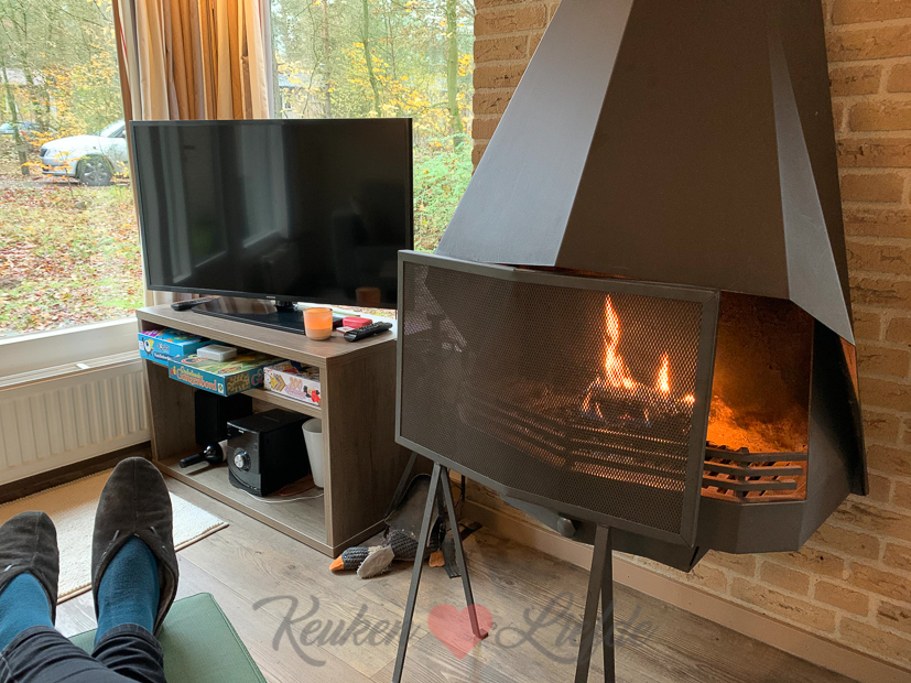 ’s Avonds gaan de openhaard en het gourmetstel aan. Een weekendje Landal is namelijk niet compleet zonder gourmet. We houden het eenvoudig. Ik een supermarkt in de buurt (de parkwinkel is veel te duur!) haal ik een kipfilet die ik zelf in blokjes snijd en kruid met zout en peper, 2 rundertartaartjes die ik gewoon in stukken breek, 2 speklapjes die ik zelf kruid met speklapkruiden en een stukje kabeljauw die ik in blokjes snijd. Ik koop bijna nooit gemarineerd vlees in de winkel. Er zit zoveel rotzooi in en vaak is het veel te zout. Verder komt er op tafel een klein bakje huzarensalade, wat plakken kaas, stokbrood, kruidenboter, knoflooksaus, een bakje rauwkost, gesneden aubergine, uien, paprika, champignons en cherrytomaatjes. Smikkelen maar!