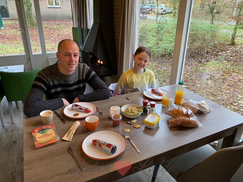 Na het uitpakken van de cadeautjes gaan Johan, Ella-Marie en Nacho verse broodjes halen. Ik dek ondertussen de tafel, maak roerei en steek de openhaard aan.