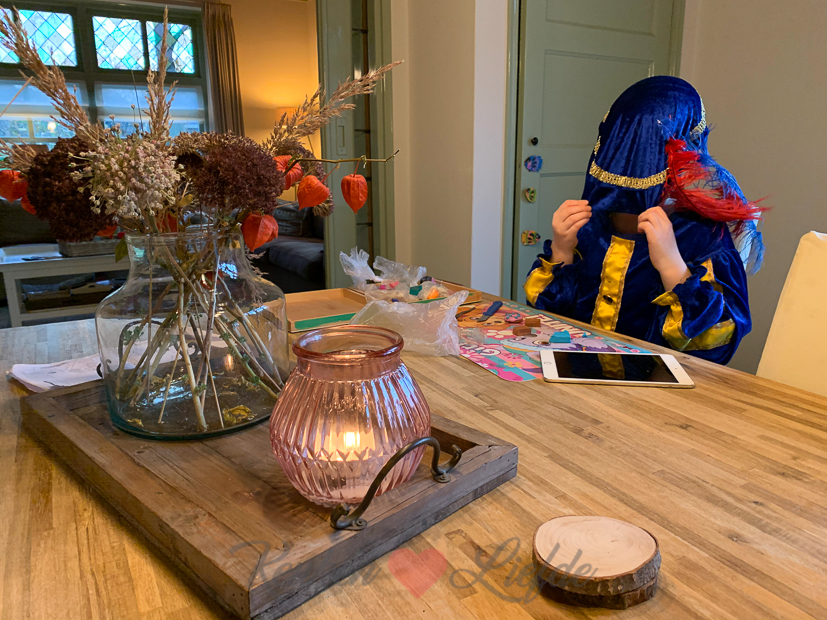 Rond drie uur ’s middags zijn we weer thuis. We knuffelen de katten Puk en Marie, pakken de koffers uit en zetten de was aan. Rond een uur of vier gaan we zitten bij onze eigen openhaard. Toch wel weer fijn om thuis te zijn. Ella-Marie trekt haar pietenpak (gemaakt door mijn tante) aan en gaat kleien en ik blader het nieuwe Delicious magazine, de kerstspecial door die ik in de brievenbus vond. Wat een heerlijke dingen staan erin! Weet jij al wat je gaat eten met de Kerst? Ik heb nog geen idee!