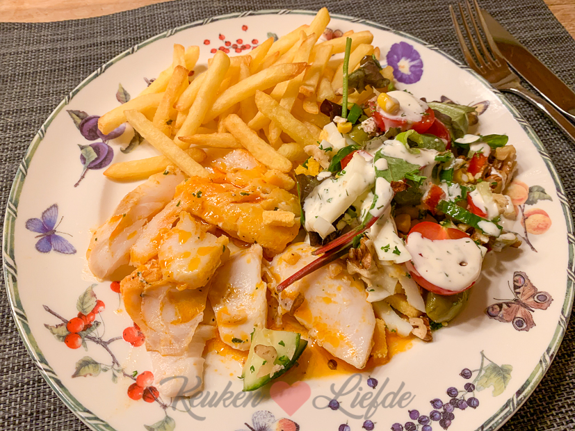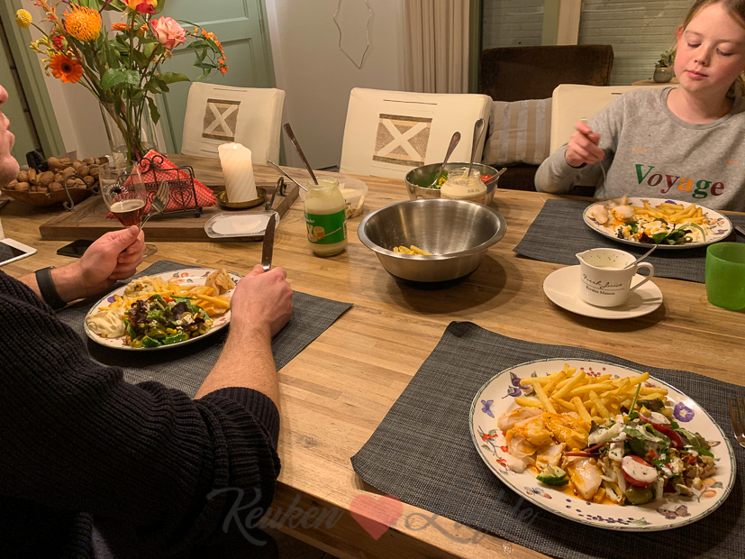 ’s Avonds eten we gebakken vis met frietjes en salade.