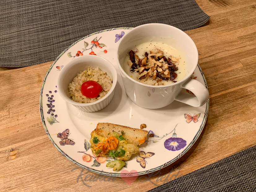Bloemkoolsoep met krokante chorizo en walnoten, risotto met champignons en Turks brood met boerenomelet.