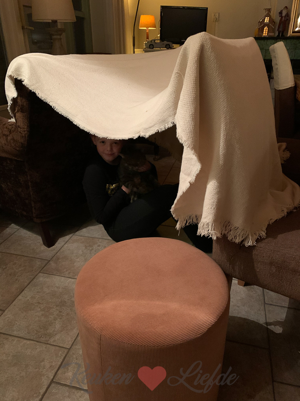 Tentje bouwen in de eetkamer voor de online-bijeenkomst van de scouting. Vanwege corona zijn de bijeenkomsten voorlopig online en voor een van de opdrachten moest er een tent worden gebouwd. Creatief omgaan met de opgelegde maatregelen en er het beste van maken. Dat doet de scouting goed!