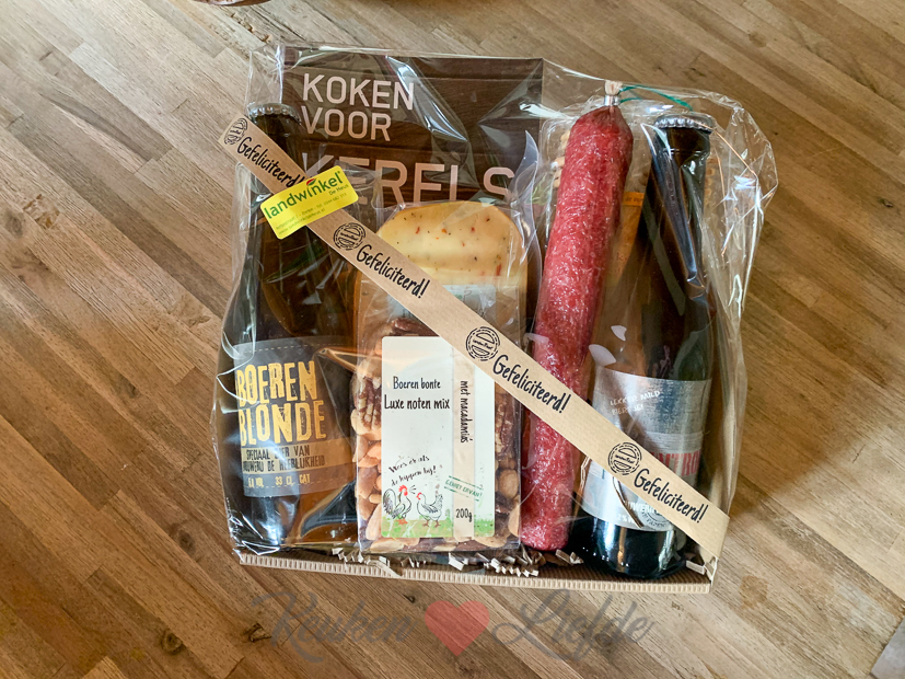Eind van de ochtend komen mijn ouders gezellig een bakkie doen en een stukje taart te proeven. Bij de landwinkel hadden ze een lekker pakket laten samenstellen voor mij en Johan want die werd vorige week zevenendertig! Vandaar het boekje ‘Koken voor snotneuzen Kerels’. ?