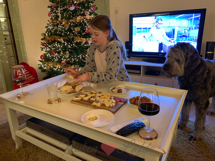 Om het weekend te vieren maakt Johan ’s avonds een borrelplankje als avondeten. Wat blokjes kaas en harde worst uit de landwinkel, zelfgemaakte eiersalade, stokbroodje met brie, walnoot en honing en bitterballen. Smullen!