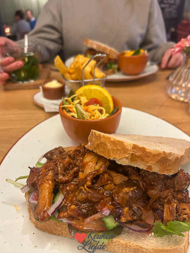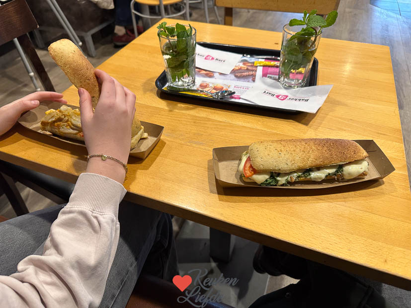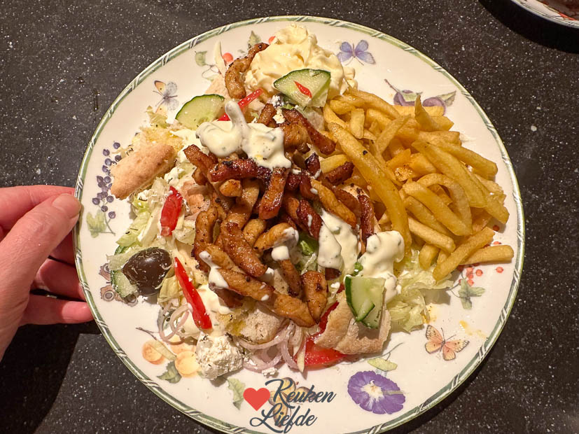 Daarna gaan de tiener en ik een broodje eten bij Bakker Bart. Als de broodjes op zijn rijden we weer naar huis waar ik achter de computer kruip om het Kijkje in de keuken te schrijven en de tiener gaat leren voor de toets van morgen. ’s Middags bakt Ella-Marie een lekkere cake en ga ik alvast aan de slag met het avondeten. Ik snijd varkensfiletlapjes in reepjes en kruid ze met deze shoarmakruiden om te marineren. Vanavond eten we pita shoarma met rauwkost salade (fijngesneden witte kool, zoete witte ui en ijsbergsla, tomaat, komkommer, olijven en feta), knoflooksaus en frietjes.