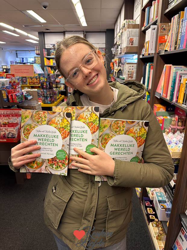 De tiener hoeft vandaag en morgen alleen maar voor een toets naar school en ik besluit haar met de auto te brengen. Ondertussen doe ik een boodschapje. Na de toets gaan we samen het winkelcentrum in en snuffelen we rond bij de Bruna. Ons kookboek ‘Makkelijke Wereldgerechten’ stond gezellig tussen de andere kookboeken in.