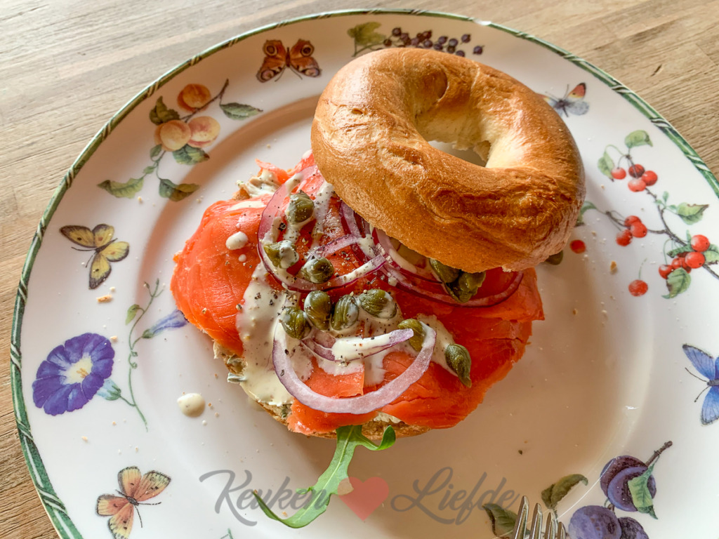 Woensdagmiddag betekent gezellig samen lunchen met mini me. Ik heb zin in iets heel lekkers, dus haal ik alle ingrediënten in huis voor een bagel met bieslookroomkaas, gerookte zalm, rucola, rode ui, kappertjes en honing-mosterddressing.