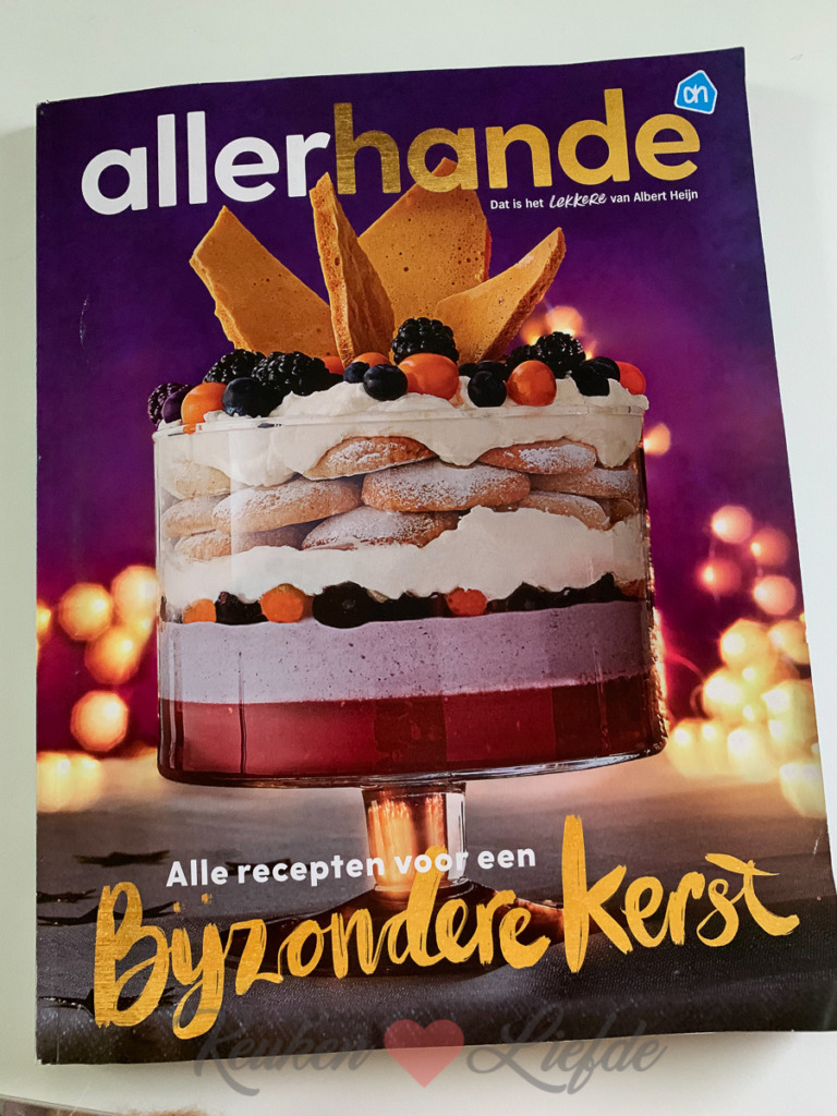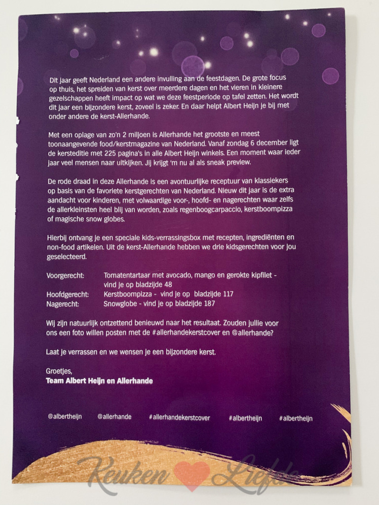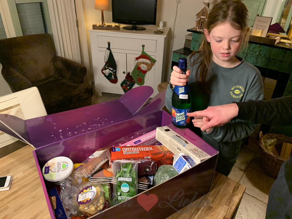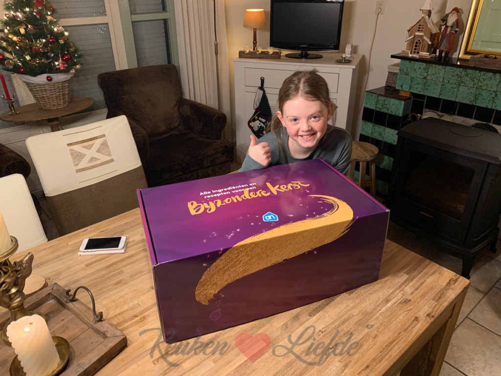 ’s Avonds hoef ik dus niet te koken, alleen op te warmen. Na het eten gaat de deurbel en krijgen we een leuke verrassing thuisbezorgd van AH: een kids-verrassingsbox met heerlijke ingrediënten o.a. voor drie leuke kidsgerechten! De recepten zijn te vinden in de dubbeldikke kerst-Allerhande die vanaf 6 december in de AH-winkel ligt. Wij kregen hem alvast als sneak preview en ik kan je verklappen dat hij bomvol lekkers staat!