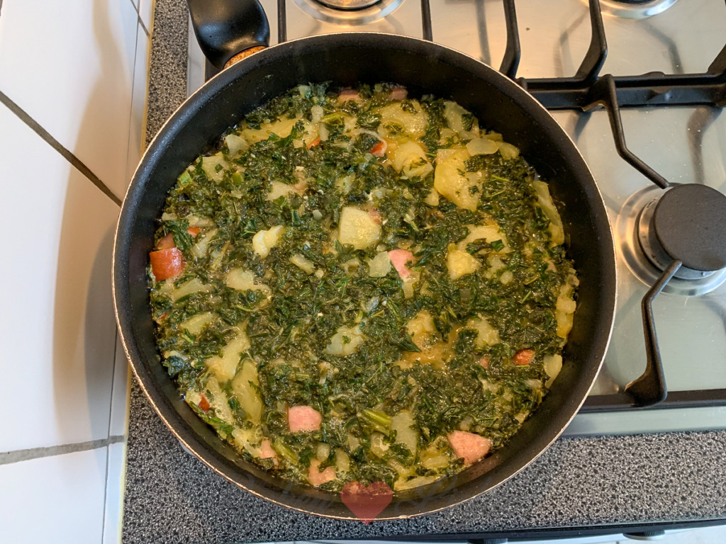 Ik sta weer in de keuken om een recept voor de website te maken en zet die op de foto. Iets met boerenkool en rookworst….