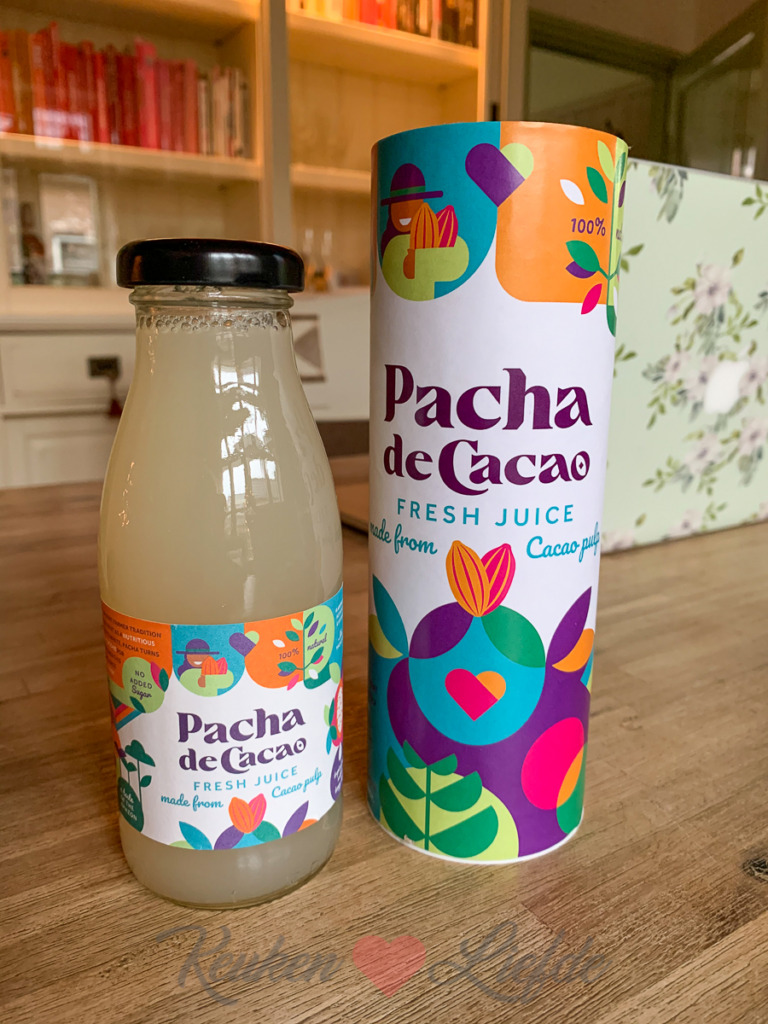 Ook krijg ik dit drankje thuisgestuurd van Pacha de Cacao: een flesje cacao sap gemaakt van vers sap van de cacaovrucht. Ella-Marie en ik hadden dorst en deelden het drankje. We vonden het geen succes helaas, voor ons veel te zoet!