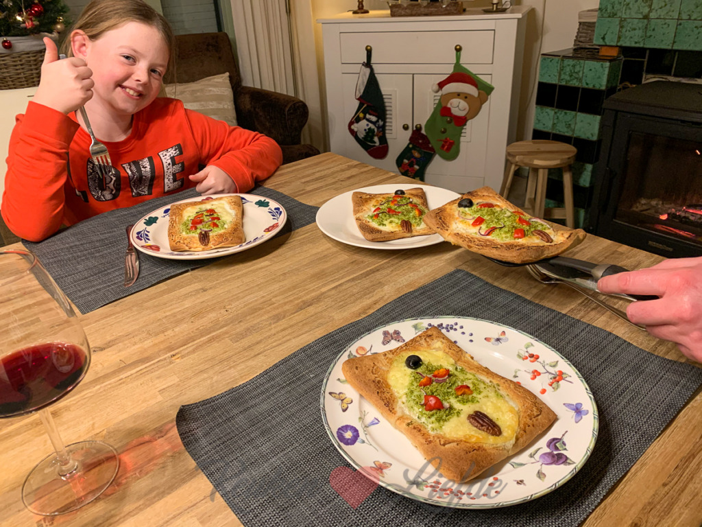 Voor het avondeten maakt Ella-Marie een van kidsgerechten uit de AH-box: de kerstboompizza!