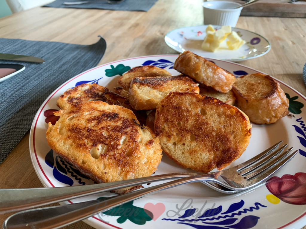 In de kast vind ik nog een zak met gesneden, oud stokbrood en daar weet ik wel raad mee. Wentelteefjes for breakfast it is!